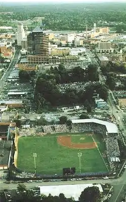 Less than two weeks after the disastrous fire that completely destroyed the stadium, a new concrete and steel grandstand, seating 1,000 spectators, opened on July 2, 1939, in time for the Bulls to face the Charlotte Hornets,[1][9] as a result, 1939 is the year from which the current DAP is normally dated.