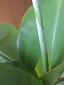 Dwarf Cavendish leaves are broad with short petioles. Its shortness makes it stable, wind-resistant, and easier to manage. This, in addition to its fast growth rate, makes it ideal for plantation cultivation.[9] An easily recognizable characteristic of this cultivar is that the male bracts and flowers are not shed.