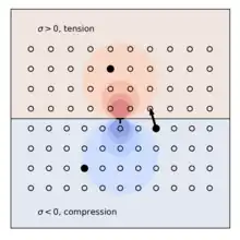 In metal alloys with substitutional solute elements, such as aluminum-magnesium alloys, dynamic strain aging leads to negative strain rate sensitivity which causes instability in plastic flow.[4] The diffusion of solute elements around a dislocation can be modeled based on the energy required to move a solute atom across the slip plane of the dislocation.[5] An edge dislocation produces a stress field which is compressive above the slip plane and tensile below.[6] In Al-Mg alloys, the Mg atom is larger than an Al atom and has lower energy on the tension side of the dislocation slip plane; therefore, Mg atoms in the vicinity of an edge dislocation are driven to diffuse across the slip plane (see figure).[5][4] The resulting region of lower solute concentration above the slip plane weakens the material in the region near the pinned dislocation, such that when the dislocation becomes mobile again, the stress required to move it is temporarily reduced. This effect can manifest as serrations in the stress-strain curve (Portevin-Le Chatelier effect).[4]