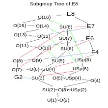The Lie algebra E8 contains as subalgebras all the exceptional Lie algebras as well as many other important Lie algebras in mathematics and physics. The height of the Lie algebra on the diagram approximately corresponds to the rank of the algebra. A line from an algebra down to a lower algebra indicates that the lower algebra is a subalgebra of the higher algebra.