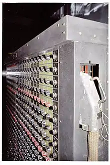 ENIAC could be programmed to perform complex sequences of operations, including loops, branches, and subroutines. However, instead of the stored-program computers that exist today, ENIAC was just a large collection of arithmetic machines, which originally had programs set up into the machine[33] by a combination of plugboard wiring and three portable function tables (containing 1,200 ten-way switches each).[34] The task of taking a problem and mapping it onto the machine was complex, and usually took weeks. Due to the complexity of mapping programs onto the machine, programs were only changed after huge numbers of tests of the current program.[35] After the program was figured out on paper, the process of getting the program into ENIAC by manipulating its switches and cables could take days. This was followed by a period of verification and debugging, aided by the ability to execute the program step by step. A programming tutorial for the modulo function using an ENIAC simulator gives an impression of what a program on the ENIAC looked like.[36][37][38]