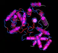 The entire secondary structure of EVI5L is made up of alpha helices, with no beta sheets present.[27][28] This is also true for EVI5Ls closest structural paralog, RABGAP1L.[29]
