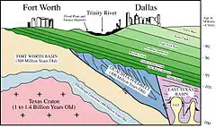 Schematic E-W section showing the Eagle Ford Shale among the geological strata beneath the DFW Metroplex