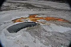 Ear Spring is a hot spring in the Upper Geyser Basin of Yellowstone National Park in the United States. Located close to Old Faithful, on rare occasions Ear Spring will erupt as a geyser, and can shoot rocks and debris as well as water more than 25 feet (7.6 m) for a few minutes. On September 15, 2018, Ear Spring was seen on the National Park Service webcam at Old Faithful erupting for a minute and reached heights of 20 to 30 ft (6.1 to 9.1 m). This was the largest eruption the pool may have had since 1957.[2] The eruption tossed small rocks out along with trash that people had thrown in it over the years and the heated water killed the surrounding bacterial mats that normally thrive in less heated conditions. Likely related to the eruption of Ear Spring, a new thermal feature opened up under the pedestrian boardwalk near Pump Geyser which resulted in the National Park Service temporarily closing off the boardwalk. This new thermal feature was spouting water the night of September 18-19, 2018. Additionally, Doublet Pool and North Goggles Geyser have both been more active in the period immediately after the rare eruption of Ear Spring.[2][3]