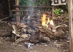 An earth oven, ground oven or cooking pit is one of the simplest and most ancient cooking structures. The earliest known earth oven was discovered in Central Europe and dated to 29,000 BC.[1] At its most basic, an earth oven is a pit in the ground used to trap heat and bake, smoke, or steam food. Earth ovens have been used in many places and cultures in the past, and the presence of such cooking pits is a key sign of human settlement often sought by archaeologists. Earth ovens remain a common tool for cooking large quantities of food where no equipment is available. They have been used in various civilizations around the world and are still commonly found in the Pacific region to date.