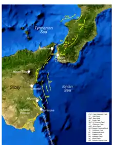 Sicily lies on part of the complex convergent boundary where the African Plate is subducting beneath the Eurasian Plate. This subduction zone is responsible for the formation of the stratovolcano Mount Etna and considerable seismic activity. Most damaging earthquakes however, occur on the Siculo-Calabrian rift zone. This zone of extensional faulting runs for about 370 kilometres (230 mi), forming three main segments through Calabria, along the east coast of Sicily and immediately offshore, and finally forming the southeastern margin of the Hyblaean Plateau. Faults in the Calabrian segment were responsible for the 1783 Calabrian earthquakes sequence.[11]