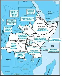 The East-Central African Division is divided into three Union Conferences, eight Union Missions, one attached Mission and one attached Territory. These are divided into local Conferences, Fields, and Missions.[2]