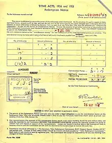 1955 tithe redemption notice for The Dingle, East Dundry. Note the £3/3/5 (£3, 3shillings, and 5pence) "redemption charge" never to again pay the annual 2/11d (2pence + 2pence + 5pence + 2shillings and 2pence = 2shillings and 11pence).
