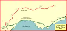 The area of land inland from the coast at Methil and Leven, known as the Riggin o Fife, had also been the scene of coal extraction in the past, but its remoteness from the harbours and the poor roads made the work unprofitable. Nonetheless the wealth of the East Fife coalfield encouraged prospecting, and reports were obtained assuring a good seam of coal at Lochty, about five miles north west of Anstruther: a 40-inch seam of good quality coal at 10 fathoms. A railway was essential to the exploitation of the mineral, and a meeting was held in Edinburgh on 19 October 1892 to propose it. As well as the coal, the agriculture of the district would benefit from a railway, and those present were positive towards paying for further surveys. The railway would connect with the Leven and East of Fife line (now in NBR ownership) forming a triangle of lines there, then running north east and forking to join the NBR main line north of Cupar, and through Lochty to join the Anstruther to St Andrews line near Stravithie. Further rich coal seams aggregating to 60 feet were said to be under the line of route. The Parliamentary Bill for the line, to be known as the East Fife Central Railway, was deposited in January 1893; it proposed share capital of £250,000.[1]