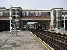 The new station was constructed in an Art Deco/Streamline Moderne design by Charles Holden with L H Bucknell.[6] Like Holden's other designs for London Underground in the 1930s, East Finchley station was inspired by European architecture (particularly Dutch) that Holden had seen on trips to the continent during that decade.[34] The track here runs roughly north-west to south-east. The imposing station building, built on rising ground adjacent to the railway bridge over High Road (A1000), has three entrances. The two main entrances to the ticket hall are on the north side of the tracks facing High Road and the third, minor entrance, is on the south side.[n 11] The entrances are linked by a passage under the tracks which provides access up to the platforms.[35]