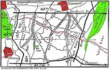 On 27 September 1918 it attacked and advanced Havrincourt Wood through the Siegfried Stellung section of the Hindenburg Line via successive planned objectives denoted Black, Red, Brown, Yellow, Blue Lines, to Welsh Ridge.[60] The Hindenburg Line was attacked in enfilade, or diagonally, as can be seen from the map. Many casualties were sustained from machine guns situated in Beaucamps to the right of the division's front during the Battle of the Canal du Nord. Its infantry relieved by New Zealand Division and withdrew to Havrincourt Wood for rest on 29 September 2018. The divisional artillery remained in action in support of the New Zealand Division in the Pursuit to the Selle.[61]