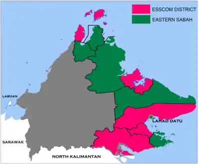 The Eastern Sabah Security Command (ESSCOM) is a Malaysian security area that covers 1,400 km of the east coast of Sabah from Kudat to Tawau.[1] It was established by Malaysian Prime Minister Dato' Seri Najib bin Abdul Razak and announced on 7 March 2013 by Musa Aman, the Sabah State Chief Minister.[2] Its purpose is to strengthen maritime security in the eastern part of Sabah following the persistent attacks by pirates and militants in the southern Philippines especially after the 2013 Lahad Datu standoff, while at the same time ensuring that trade and business activity are not affected.[1] The ESSCOM headquarters and main bases is at Lahad Datu.