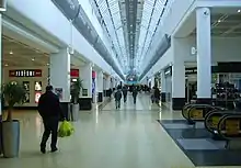 A later application was accepted, although now without a multiplex cinema. The listed building was moved brick-by-brick to the other side of Falcon Square, and now hosts Pizza Express and Laura Ashley.[6] Building work started in 2001 and was opened in 2003. This new development included two bridge walkways connecting the new phase with the existing shopping centre, complete with Debenhams as the anchor store, and a new food court.[7] The expansion of Eastgate and the construction of the Falcon Mall was deemed one of 'the most impressive planning projects in Scotland in recent years' and was the overall winner of the Scottish Awards for Quality in Planning 2003.[8]