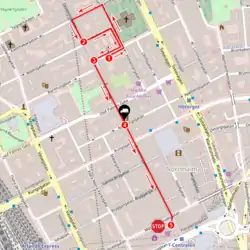 The hijacker then drove the truck at high speed into a pedestrian street, going about 500 metres (1,600 ft) down Drottninggatan, one of Stockholm's main shopping streets, hitting pedestrians along the way. Witnesses said the hijacker attempted to target children as he zigzagged on the street.[13] The attack ended when the truck slammed into the Åhléns City department store on the corner of Drottninggatan and Mäster Samuelsgatan. The truck caught fire, but the flames were quickly doused by firefighters. The hijacker jumped out and fled the scene.[14]