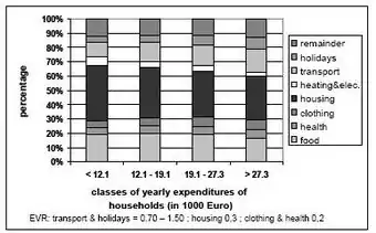 The eco-costs/value ratio (EVR) is an indicator to reveal sustainable and unsustainable consumption patterns of people. The eco-costs is an indicator for the environmental pollution of the products people buy, the value is the price they pay for it in our free market economy. Example: When somebody spends 1000 euro per month on housing (in Europe: EVR approx. 0,3) it is less harmful for the environment than when 1000 euro is spent on diesel (in Europe: EVR approx. 1,0). See section 3.1.