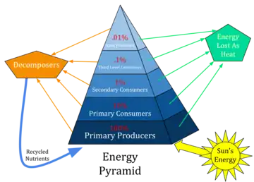 Energy usually enters ecosystems from the Sun. The primary producers at the base of the pyramid use solar radiation to power photosynthesis which produces food. However most wavelengths in solar radiation cannot be used for photosynthesis, so they are reflected back into space or absorbed elsewhere and converted to heat. Only 1 to 2 percent of the energy from the sun is absorbed by photosynthetic processes and converted into food.[1] When energy is transferred to higher trophic levels, on average only about 10% is used at each level to build biomass, becoming stored energy. The rest goes to metabolic processes such as growth, respiration, and reproduction.[2]