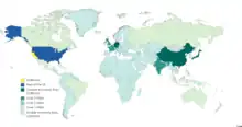 California has historically derived significant revenue from international trade and tourism. However, the state's share of America's merchandise export trade has been steadily shrinking since 2000, from 15.4% to 11.1% in 2008.[29] The exports of goods made in California totaled $134 billion in 2007. $48 billion of that total was computers and electronics, followed by transportation, non-electrical machinery, agriculture, and chemicals. California trade and exports translate into high-paying jobs for over one million Californians. According to the US Bureau of Economic Analysis (BEA), in 2005, foreign-controlled companies employed 542,600 California workers, the most of any state. Major sources of foreign investment in California in 2005 were Japan, the United Kingdom, Switzerland, France, and Germany. Foreign investment in California was responsible for 4.6 percent of the state's total private-industry employment in 2009.[30] Total direct travel spending in California reached $96.7 billion in 2008, a 0.8% increase over the preceding year.[31] Los Angeles County receives the most tourism in the state.[31]