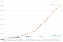 South Korea's real GDP expanded by an average of more than 8 percent per year,[42] from US$2.7 billion in 1962[43] to US$230 billion in 1989,[44] breaking the trillion dollar mark in the early 2000s. Nominal GDP per capita grew from $103.88 in 1962[45] to $5,438.24 in 1989,[46] reaching the $20,000 milestone in 2006. The manufacturing sector grew from 14.3 percent of the GNP in 1962 to 30.3 percent in 1987. Commodity trade volume rose from US$480 million in 1962 to a projected US$127.9 billion in 1990. The ratio of domestic savings to GNP grew from 3.3 percent in 1962 to 35.8 percent in 1989.[42] In the early 1960s, South Korea's rate of growth exceeded North Korea's rate of growth in most industrial areas.[47]