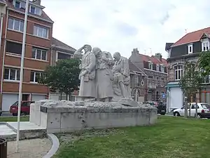 The war memorial (French: monument aux morts), "distinguished by its size, style, originality and sobriety", shows four wounded soldiers who have returned from the front and are heading for a first aid post. The leading soldier has been blinded. His right hand is held to his eyes and his left hand seems to be feeling for a way forward. The second soldier has been gassed and leans his head on the blinded soldier. Behind him the third man appears on the point of collapse and he is supported by the last of the soldiers who is also wounded and is clearly in a state of great shock. This monument stands in the place Delta in Malo-Les-Bains.[2]