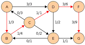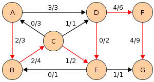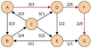 In computer science, the Edmonds–Karp algorithm is an implementation of the Ford–Fulkerson method for computing the maximum flow in a flow network in time. The algorithm was first published by Yefim Dinitz in 1970,[1][2] and independently published by Jack Edmonds and Richard Karp in 1972.[3] Dinitz's algorithm includes additional techniques that reduce the running time to .[2]