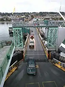Both terminals at Edmonds and Kingston are equipped with overhead passenger loading. Edmonds is equipped with one vehicle slip, while Kingston is equipped with two. There is also a passenger-only dock at Kingston. It was previously used for the Soundrunner, a passenger only fast-ferry service to Seattle that the Port of Kingston operated between Fall 2010 and Fall 2012.[3] The dock was utilized again starting in November 2018 when Kitsap Transit resumed passenger only fast-ferry service to Seattle with MV Finest.[4]