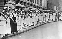 In 1916, she participated in a women's rights protest dubbed "The Golden Lane" at the Democratic Party's national convention, held that year in St. Louis. Some 7,000 women carrying yellow parasols and wearing yellow sashes lined both sides of the road leading to the St. Louis Coliseum.[6] In the front row were two little girls, Mary Taussig and Martha Gellhorn (Gellhorn's daughter), representing future voters.[7] A black-cloth-draped tableau of "states with no votes for women" was placed in front of the St. Louis Art Museum.