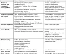 The educational sector is under the responsibility of the Ministre de l'Éducation Nationale et de la Formation Professionnelle (MENFP).[5] The Ministry provides very little funds to support public education. As a result, the private sector has become a substitute for governmental public investment in education as opposed to an addition.[6] The Ministry is limited in its ability to improve the quality of education in Haiti.[7]