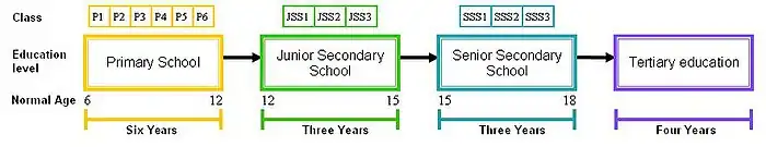 Sierra Leone's education system is divided into four stages; primary education lasting six years, junior secondary education of three years, three years of either senior secondary education or technical vocational education and four years of university or other tertiary education.[13]
