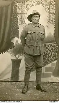 He enlisted with the AIF as a Private in the 47th Battalion (Australia) and embarked from Brisbane in May 1916 on HMAT A46 Clan Macgillivray. He was killed on the first day of the First Battle of Passchendaele in Belgium on 12 October 1917.[7] He was one of 3,199 Australian lives lost in the battle.