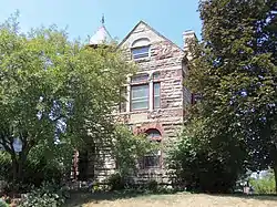 The Edinger House is a 2½-story structure that follows an irregular plan in a generalized medieval style. It features a corner tower with a conical roof in one the angles in the front of the house. The dominant feature of this structure is its masonry.[3] The walls are composed of ashlar brownstone, laid in a random pattern. A lighter colored stone was used for the belt coursing. The second floor is framed with rubble stone, and it is also found on the gable ends. Edinger's stone business may have contributed to the idiosyncratic nature of the house's design.[3]