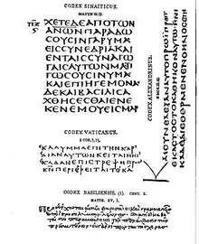 - 1 2 Tischendorf, Constantin von (1881). Leigh, Dr Edwin (ed.). The Sinai and comparative New Testament: The authorized English version; with introduction, and various readings from the three most celebrated manuscripts of the original Greek text. The New Testament as the early christians had it in the fourth century ;vol. 1 ; Gospels. New York: Ivison, Blakeman, Taylor, and company.