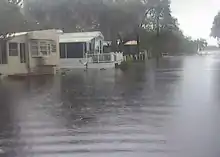 A damage survey conducted by the National Weather Service indicates that a tornado was spawned near St. Cloud in Osceola County. It destroyed an abandoned mobile home, leaving only a floor attachment to the frame. The tornado moved across a citrus grove, causing damage to trees and shrubs. Thereafter, it removed shingles and broke a window at one residence, while some fences nearby were toppled.[14] Additionally, rainfall amounts ranging from 3 to 6 inches (76 to 152 mm) left several roads impassable. The Myakka River overflowed in Sarasota County, flooding the Ramblers Mobile Home Park. Water rose up to the doorsteps of several units, while parking lots and grassy areas were inundated by water.[11] Due to its weaker and further westward track than initially anticipated, impact in Hillsborough County and the city of Tampa was minimal during the Republican National Convention. On the first day of the convention, August 27, Isaac dropped 2.03 inches (52 mm) of precipitation and brought sustained winds of 21 mph (34 km/h) to Tampa International Airport, with gusts up to 50 mph (80 km/h).[27] A waterspout moved onshore near Tampa, damaging 6 houses in addition to the fences and trees on those properties.[12]