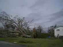 A man in the unincorporated community of Loxahatchee died after he was crushed by a tree that pushed him into the windshield of his vehicle.[100] The metal roof at Western Pines Middle School was peeled back, exposing multiple classrooms.[101] In nearby Royal Palm Beach, 331 homes were impacted.[92] Damage there reached about $9 million, including about $1.5 million to village property.[102] The village of Wellington suffered severe damage. The community center nearly lost its roof, the bleachers around the pool collapsed, and fences and canopies surrounding the tennis courts were destroyed. A few local parks experienced similar effects to their bleachers and sports facilities.[103] Palm Beach Central High School was severely damaged. Its kitchen and cafeteria lost portions of their roof, the theater and media center were flooded, the gym suffered a roof leak, and trees, signs, and fences were knocked down throughout campus.[104] Many trees and utility poles were snapped at The Mall at Wellington Green.[91] Approximately 3,955 homes were impacted and 4 others destroyed.[92] Overall, Wellington suffered almost $62 million in damage, with $50.4 million to property, and $3.8 million to public facilities, with repairs costs reaching almost $5.9 million.[105]