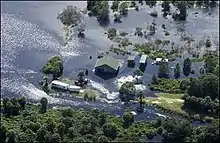 At Lake Harbor, a tiny lakefront community near the western boundary of Palm Beach County, only seven homes were left standing after the hurricane.[95] About 743 homes[92] – roughly 80% of the dwelling in South Bay – were damaged,[93] and 63 residences were destroyed.[92] The city hall and the fire station suffered heavy roof damage.[96] In Canal Point, trees, branches, power lines, and electrical poles were toppled. Almost complete destruction of the community's mobile homes parks occurred. Several other homes and buildings were inflicted with serious damage.[89] Overall, damage occurred at about 60% of homes in Canal Point.[94] Some historical buildings damaged by hurricanes Frances and Jeanne in 2004 were destroyed by Wilma.[97] State Road 80, one of the only routes between eastern and western Palm Beach County, was closed after a Florida Power & Light transmission line fell across the highway about 1 mi (1.6 km) west of Lion Country Safari.[91] At the Loxahatchee National Wildlife Refuge (NWR), 85% of tree islands – "small, wetland forest communities imbedded in a matrix of freshwater marsh" – were damaged by the storm. Less than 50% of the canopies were removed at most tree islands, while the tree islands that suffered the worst impact had larger trees and were near the center of Loxahatchee NWR.[98] The office and visitor centers were both severely damaged and later rebuilt.[99]