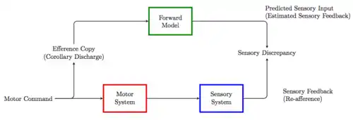 This efference copy, by providing the input to a forward internal model, is then used to generate the predicted sensory feedback that estimates the sensory consequences of a motor command. The actual sensory consequences of the motor command are then deployed to compare with the corollary discharge to inform the CNS about how well the expected action matched its actual external action.[4]