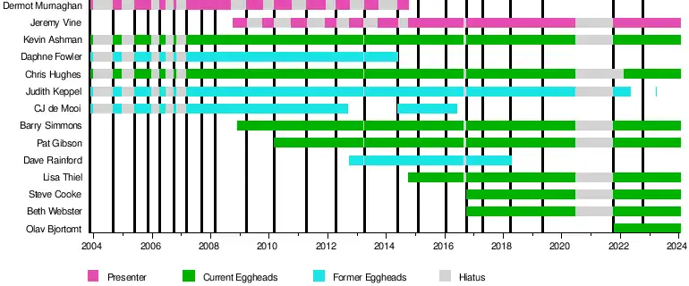 In the first eight series, the team consisted of only five Eggheads who each appeared in every episode and did not rotate. At the end of 2008, a sixth Egghead was added and appearances rotated. From series 15, five of eight possible Eggheads appear each episode, and later in 2016, two brand-new Eggheads (one male and one female) joined the panel after a spin-off series entitled Make Me an Egghead. Currently, there are 8 Eggheads (6 male and 2 female): Kevin Ashman, Chris Hughes, Barry Simmons, Pat Gibson, Steve Cooke, Olav Bjortomt, Lisa Thiel and Beth Webster and they currently appear on Channel 5.