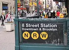 The Eighth Street–New York University station (sometimes shortened as 8th Street–NYU) is a local station on the New York City Subway's BMT Broadway Line. Located at the intersection of Eighth Street and Broadway in Greenwich Village, Manhattan, it is served by the R train at all times except late nights, the W train on weekdays, the N train during late nights and weekends, and the Q train during late nights.