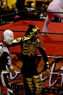 He began wrestling under the ring name "Black Spirit" and wore a mask and outfit that was greatly inspired by his father's iconic skeleton suit. Both L.A. Park and Black Spirit denied they were related, using a storyline that Black Spirit was a big fan of L.A. Park and had been given permission to use a variation of the mask.[2] At other points it was claimed that Black Spirit was L.A. Park's "star pupil" to explain the almost identical masks without admitting to the family relationship.[5] Initially Black Spirit worked for various local wrestling promotions in Mexico, gaining valuable experience as he worked with or against other Skayde students such as Black Thunder, Turbo, Skayde, Jr. and Skayde himself.[2] He developed a long running feud with Black Thunder, a feud Black Spirit himself hoped would lead to his first ever Lucha de Apuesta, bet match.[2] Black Spirit challenged Skayde for his NWA Mexico Welterweight Championship in a Torneo cibernetico style match, but lost to Turbo.[6] Black Spirit was initially described as "nervous but with promise" after one of his early matches.[7] In interviews he stated that he preferred the high flying style but could also mat wrestle if need be.[2] Through his father's connections Black Spirit often worked on the same shows as his father, including the debut show for the Perros del Mal Producciones where his father was headlining the show. Black Spirit teamed with Turbo and Super Nova to defeat Black Thunder, Cerebro Negro and X-Fly in the third match of the night.[8] Afterwards it was commented that Black Spirit was impressive in his first showing for Los Perros del Mal.[9] He also appeared in the semi-main event at a tribute show held for Pierroth, Jr., teaming with Guerrero Maya, Jr. and Canelo Casas against El Hijo de Cien Caras, Cien Caras, Jr. and Máscara Año 2000, Jr. The show also featured L.A. Park in the main event.[10] Throughout 2009 Black Spirit kept appearing on Perros del Mal shows that also featured LA Park,[11] leading to further speculation that the two were indeed related. By early 2010 it was a very poorly kept secret that Black Spirit was the son of LA Park.[12][13]