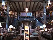El Rancho Hotel, Gallup, New Mexico, is a historic hotel built by R.E. “Griff” Griffith,[2] the brother of film director D.W. Griffith. The pair encouraged early film production in the surrounding area.[2] It is located on old U.S. Route 66 and became the temporary home for many Hollywood movie stars.The rambling, three-story hotel building has a large portico with a central balcony reminiscent of the Southern Plantation style. The National Park Service describes it as having a “rusticated fantasy appearance.” Materials include brick, random ashlar stone, and roughewn wood with a wood shake roof and brick and stone chimneys. The lobby features a spectacular walk-in fireplace made of brick and random ashlar stone surrounded by twin stairways made of split logs that lead to the second floor guest rooms.[2] The slogan “Charm of Yesterday, Convenience of Tomorrow” is rendered in neon above the main entrance.[3]