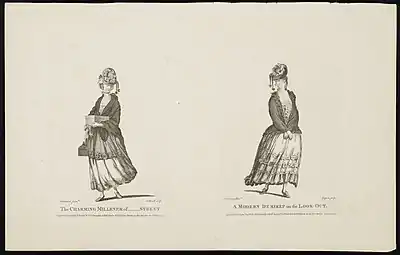 This and other period criticisms as well as the prevalence of satirical prints have led some historians to believe that milliners were not respected and thought to be nothing less than prostitutes. Other historians have looked more closely at the trade and women's roles in the eighteenth century and believe that milliners were actually highly respected. Work by Amy Erickson and Jessica Collins with the records of the Clockmakers' and Clothworkers' companies show that the girls apprenticed to milliners came from mainly middling class families - their fathers were clergyman, apothecaries, goldsmiths, clerks, shopkeepers, and other similar trades and occupations.[2][22] By contrast, the fathers of most of the boys apprenticed in the Clockmakers' company were from lower-status trades.[23] With premiums to apprentice a girl to a milliner higher than those paid in general for boys, it is unlikely that parents would have paid to put their daughters into an occupation that was so associated with prostitution.[24] Jessica Collins also notes that of the seventeen milliners operating through the Clothworkers' Company, most were based in the more prominent areas of London further demonstrating that the millinery trade was prestigious.[25]