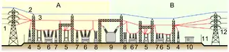 A transmission substation connects two or more transmission lines.[3] The simplest case is where all transmission lines have the same voltage. In such cases, substation contains high-voltage switches that allow lines to be connected or isolated for fault clearance or maintenance. A transmission station may have transformers to convert between two transmission voltages, voltage control/power factor correction devices such as capacitors, reactors or static VAR compensators and equipment such as phase shifting transformers to control power flow between two adjacent power systems.