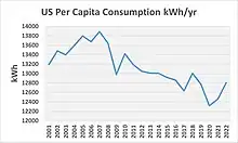 Electricity consumption per person (per capita) is based upon data mined from US DOE Energy Information Administration/Electric Power Annual 2022 files[10] Population[11] data is from Demographics of the United States. Per capita consumption in 2022 is 12,809 kWh. This is up 351 kWh from 2021 and down 1.8% from a decade ago and down 7.2% from its peak in 2007. The following table shows the yearly US per capita consumption by fuel source from 1999 to 2022.