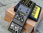 Launched in 1978, the "Wasp" was EDP's best-received product. It was named after its black-and-yellow colour scheme. For cost reasons, it did not have a mechanical keyboard; instead, it used flat conductive copper plates, hidden under a silk-screened vinyl sticker.[1] This alienated some players who thought the instrument lacked the expression present with a real keyboard.[2] It was also difficult to use in live settings, and according to Gerald Casale of Devo, the synth would play itself when exposed to sweat.[3] Despite these flaws, the Wasp was fairly advanced technologically. It was one of the first commercially available synthesisers to adopt digital technology, which at the time was just beginning to become a standard. It also utilised a proprietary system for connecting several Wasp synthesisers together, predating MIDI by several years.[1][lower-alpha 1] The Wasp had a tiny internal speaker, which gave the instrument a distinctive sound, though it could also be amplified externally. Eurythmics' David A. Stewart recorded the Wasp by miking its internal speaker.[1]