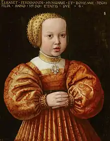 Elizabeth spent most of her childhood in the Hofburg, Innsbruck. She was raised with strict discipline and received a good education from humanist Kaspar Ursinus Velius,[1] but was not taught the Polish language despite her early arranged marriage to Sigismund II Augustus.[2] The marriage plan was first discussed when Elizabeth was only a one year old. Louis, King of Hungary and Bohemia, died in August 1526 without leaving an heir. The Hungarian throne was contested between Louis' brother-in-law Ferdinand I and John Zápolya.[2] Louis' uncle Sigismund I the Old and Hungarian nobility supported Zápolya. The marriage of Elizabeth to Sigismund's son was proposed as the means to end Polish support to Zápolya.[2] The Polish Queen Bona Sforza opposed the wedding as she opposed the growing influence of the Habsburgs.[3]