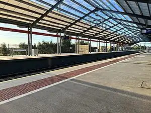 In July 2011, the station was demolished and rebuilt as part of a $40 million station upgrade project.[4] Approximately $15 million was allocated for a complete rebuild of Elizabeth Station, including construction of two new side platforms, a pedestrian overpass, and a bus interchange facility.[5][6] In anticipation of increasing passenger numbers on the Gawler line, an additional $12 million was budgeted to construct a rail turnback facility north of Elizabeth station, allowing trains to terminate at Elizabeth and return to Adelaide, or remain stabled at Elizabeth.[7] The revamped station officially opened in April 2012.[8] As of 2023, the turnback facility at Elizabeth is yet to be used as part of a timetabled service.