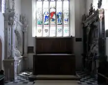 He died in 1635 and was buried in St. Andrew's Chapel (the "Cannons' Vestry") in Exeter Cathedral, as was also his wife when she died on 20 June 1636.[22] His elaborate monument with semi-recumbent alabaster effigy survives on the south side of the chancel in Bovey Tracey Church, opposite that of Nicholas Eveleigh, his second wife's first husband.
