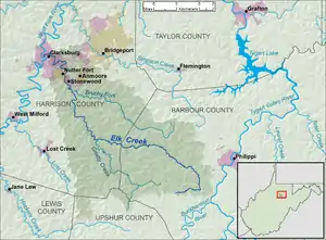 Elk Creek is a tributary of the West Fork River, 29 miles (47 km) long,[3] in north-central West Virginia, USA. Via the West Fork, Monongahela and Ohio Rivers, it is part of the watershed of the Mississippi River, draining an area of 121 square miles (310 km2)[4] on the unglaciated portion of the Allegheny Plateau. The stream is believed to have been named by an 18th-century trapper and hunter named John Simpson, who encountered herds of elk along the stream.[5]