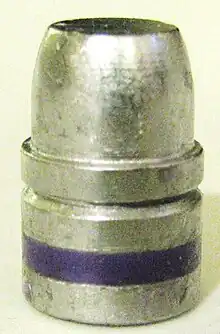 Originally Keith specified a meplat that was 65% of the bullet caliber, but later increased it to a 70% meplat. The other distinguishing characteristics of a "Keith-style" SWC are a double radius ogive, beveled crimp groove, three equal width driving bands, wide square bottomed grease groove, and a plain base with sharp corners. The wide forward driving band helps keep the bullet aligned as it jumps across the cylinder gap. Because of the three wide equal width driving bands, the total bearing surface is half the length of the bullet. The relatively large bearing surface helps the Keith-style SWC to be an inherently accurate bullet and minimizes pressure leakage due to projectile blow-by.[7] The wide square bottom grease groove holds ample lubricant.[8]