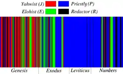 Friedman's distribution of materials by source of the first four books of the Hebrew Bible, including a redactor (black), according to the documentary hypothesis.[74][75]