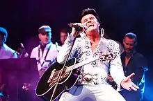 An Elvis impersonator is an entertainer who impersonates or copies the look and sound of American musician and singer Elvis Presley. Professional Elvis impersonators, commonly known as Elvis tribute artists (ETAs), work all over the world as entertainers, and such tribute acts remain in great demand due to the unique iconic status of Elvis. There are even several radio stations[1][2] that exclusively feature Elvis impersonator material. Some of these impersonators go to Graceland on the anniversary of Presley's death to make their personal tribute to the artist.[3]